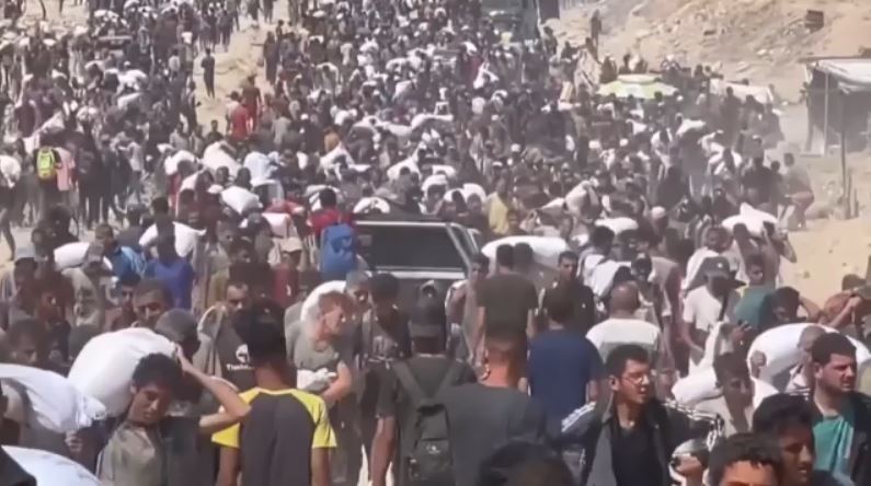 Εκατοντάδες Παλαιστίνιοι τρέχουν με όση δύναμη τους έχει απομείνει για να πάρουν λίγα τρόφιμα στην Γάζα.