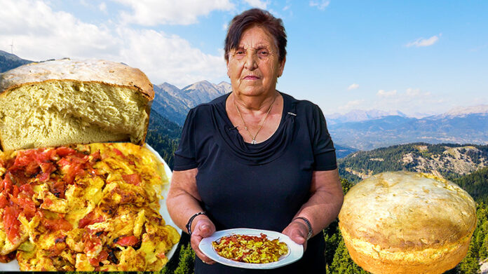 Με απλά υλικά, τα οποία αφθονούσαν στα σπίτια του χωριού κατά τη διάρκεια του καλοκαιριού, η κυρία Φωτεινή μας ετοίμασε ένα πρόχειρο, μα πεντανόστιμο γεύμα. Ντομάτες, αυγά, λάδι, νερό και αλάτι, μεταμορφώθηκαν σε ένα πιάτο που μοσχοβολούσε παράδοση. Στο τραπέζι, το ζυμωτό ψωμί που είχε φτιάξει η ίδια, συμπλήρωνε την αυθεντική αυτή γευστική εμπειρία.