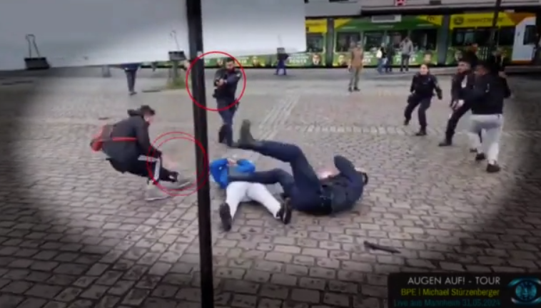 Επικρατεί πανικός. Αστυνομικοί που βρίσκονται στην κεντρική πλατεία της πόλης του Μάνχαϊμ στα δυτικά της Γερμανίας επιχειρούν να αφοπλίσουν το δράστη.