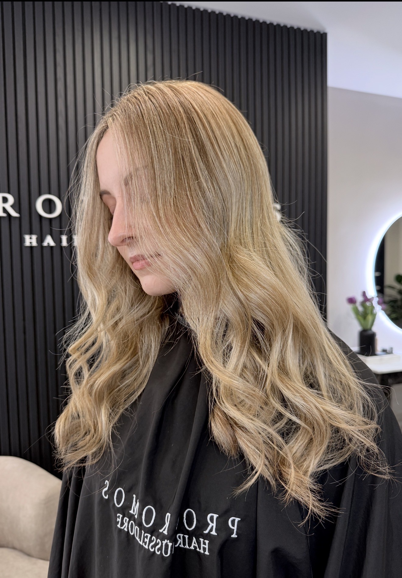 Ζεστό ξανθό με χρυσές και μελί ανταύγειες που φωτίζουν το πρόσωπο.