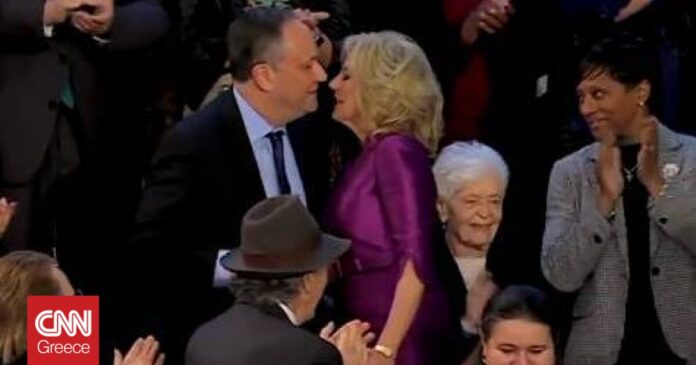 Οι κάμερες κατέγραψαν τη στιγμή που η Τζιλ Μπάιντεν έφτασε στο Κογκρέσο, κατευθύνεται στη θέση της και χαιρετά με ένα φιλί στον στόμα τον Νταγκ Έμχοφ (Doug Emhoff), σύζυγο της Αντιπροέδρου των ΗΠΑ, Καμάλα Χάρις.
