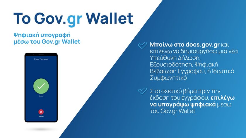 Τέλος, μέσω του Gov.gr Wallet ο πολίτης μπορεί να υπογράφει ταχύτερα και ασφαλέστερα έγγραφα μέσω του docs.gov.gr. Συγκεκριμένα, εφόσον ο πολίτης έχει εγκαταστήσει στο κινητό του τηλέφωνο την εφαρμογή και έχει αποθηκεύσει την αστυνομική του ταυτότητα, θα μπορεί να επιλέξει και να εγκρίνει την έκδοση ενός ψηφιακού εγγράφου μέσω της εφαρμογής αντί να λάβει με SMS έναν κωδικό μιας χρήσης (OTP – One Time Password).