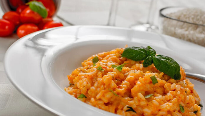 Αφήστε το ριζότο να ξεκουραστεί για λίγα λεπτά και, στη συνέχεια, ανακατέψτε το υπόλοιπο βούτυρο, την παρμεζάνα και τον βασιλικό.