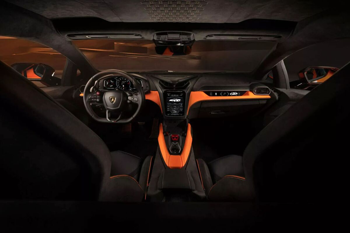 Το αυστηρά διθέσιο εσωτερικό της νέας Lamborghini είναι πλήρως ψηφιακό με έναν πίνακα οργάνων με διαγώνιο 12,3 ιντσών, μια οθόνη αφής 8,4 ιντσών στην κεντρική κονσόλα και μια 9,1 ιντσών μπροστά από το συνοδηγό.