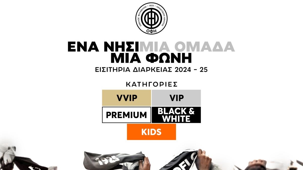 «Με το σύνθημα «ΈΝΑ ΝΗΣΙ, ΜΙΑ ΟΜΑΔΑ, ΜΙΑ ΦΩΝΗ» και με σταθερή τιμολογιακή πολιτική σε όλες τις Θύρες, η ΠΑΕ ΟΦΗ ανακοινώνει την έναρξη της διάθεσης των εισιτηρίων διαρκείας για την αγωνιστική σεζόν 2024-25.