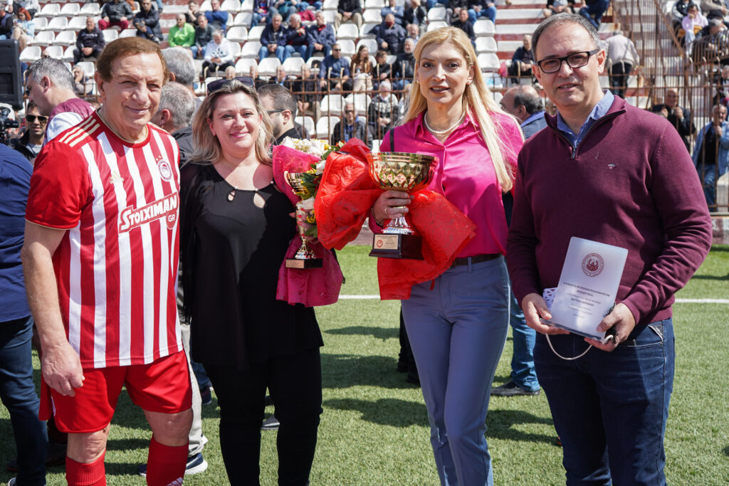Αρκετός κόσμος στο γήπεδο της Προοδευτικής είχε την ευκαιρία να δει από κοντά μεγάλες μορφές της ιστορίας του Ολυμπιακού, με τις δύο ομάδες αρχικά να πραγματοποιούν διάφορες βραβεύσεις.
