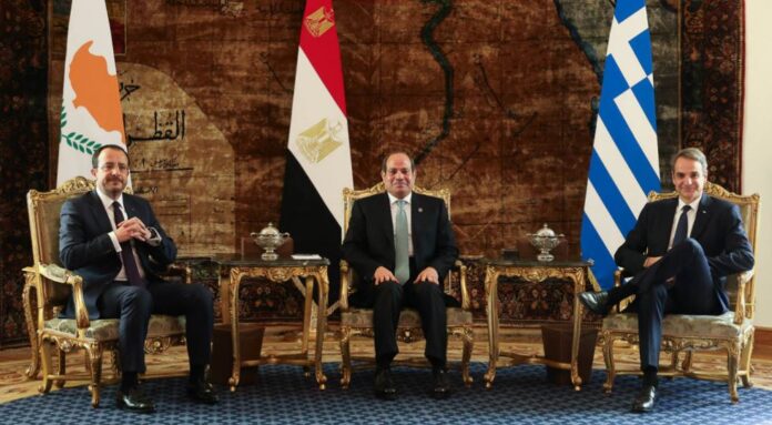 Μήνυμα συνεργασίας και περιφερειακής ασφάλειας στην ταραγμένη περιοχή της ανατολικής Μεσογείου έστειλαν με την τριμερή τους συνάντηση Κυριάκος Μητσοτάκης, Νίκος Χριστοδουλίδης και Φατάχ Αλ Σίσι από το Κάιρο.