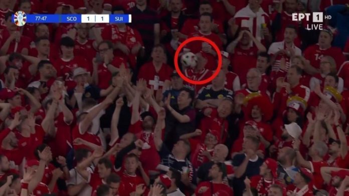 Ο επιθετικός της Ελβετίας σε μια προσπάθεια που επιχείρησε για να γίνει σκόρερ δεν κατάφερε να βρει δίχτυα, με την μπάλα να πηγαίνει στις εξέδρες πετυχαίνοντας έναν θεατή.