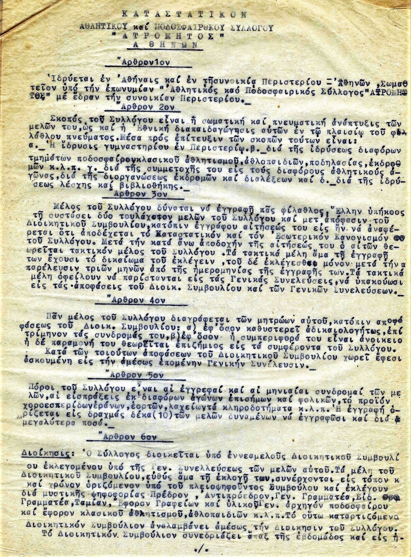 Ο Ατρόμητος δημιουργήθηκε από μια παρέα φίλων που σύχναζε στην πλατεία Κυριακού (σημερινή Πλατεία Βικτωρίας) αλλά δεν ξέραμε ποια ήταν η αρχική «έδρα» της ομάδας. Το ντοκουμέντο αποδεικνύει ότι καταστατική έδρα του Ατρόμητου από την πρώτη στιγμή ήταν το Περιστέρι.