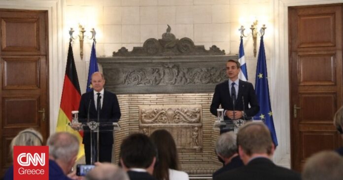 Για όλα τα κρίσιμα ζητήματα ενημέρωσε ο πρωθυπουργός Κυριάκος Μητσοτάκης τον Γερμανό καγκελάριο Όλαφ Σολτς, όπως ανέφερε ο πρώτος στις κοινές δηλώσεις τους στον Τύπο, μετά την κατ’ιδίαν συνάντησή τους.