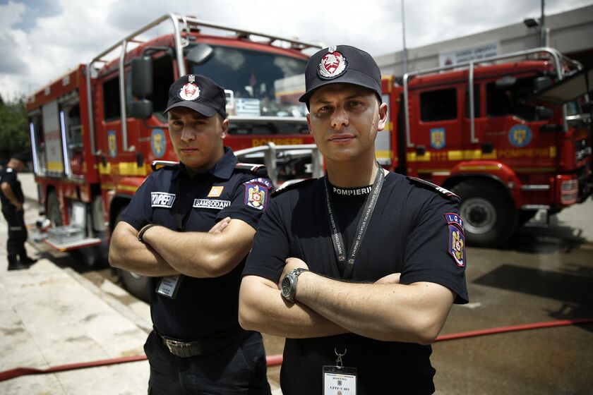 Ο πύραρχος, Αλεξάντρου Τσίλικ και ο επιπυραγός Καταλίν Σαμσοντάν φορώντας τις σκούρες μπλε στολές τους που πάνω τους έχει τοποθετηθεί το σήμα των ρουμάνικων δυνάμεων γενικής επιθεώρησης για έκτακτες καταστάσεις (IGSU) έχουν αφήσει τις βάσεις τους στην Οραντέα και στο Βουκουρέστι της Ρουμανίας.