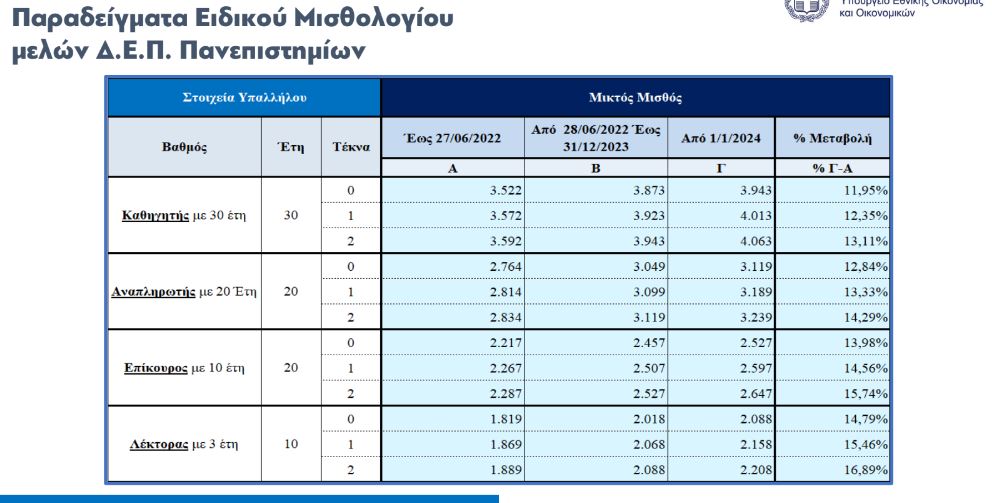 ευρώ καθαρά, (μετά από κρατήσεις και φόρο εισοδήματος) κατ’ έτος από το 2024 και εφεξής. Επιπλέον υπάρχει επιπρόσθετο κόστος 49,8 εκατ. ευρώ για το 2023 που αφορά την αναδρομική αναπροσαρμογή μισθολογίου των μελών ΔΕΠ.