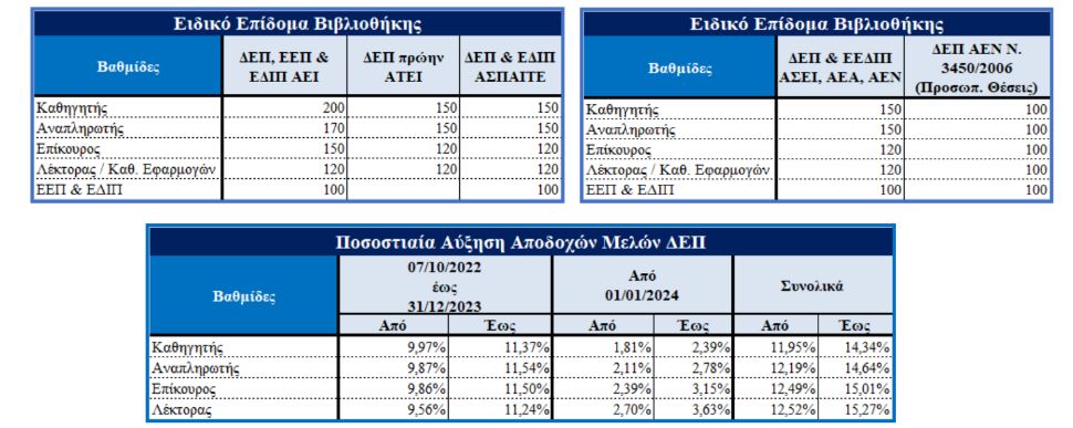 - Χορηγείται στα μέλη ΔΕΠ των ΑΕΙ, επιπλέον των ανωτέρω και σε συμμόρφωση με τις αποφάσεις του ΣτΕ, ειδικό επίδομα βιβλιοθήκης από 100 έως 200 ευρώ ανάλογα την εκπαιδευτική βαθμίδα.