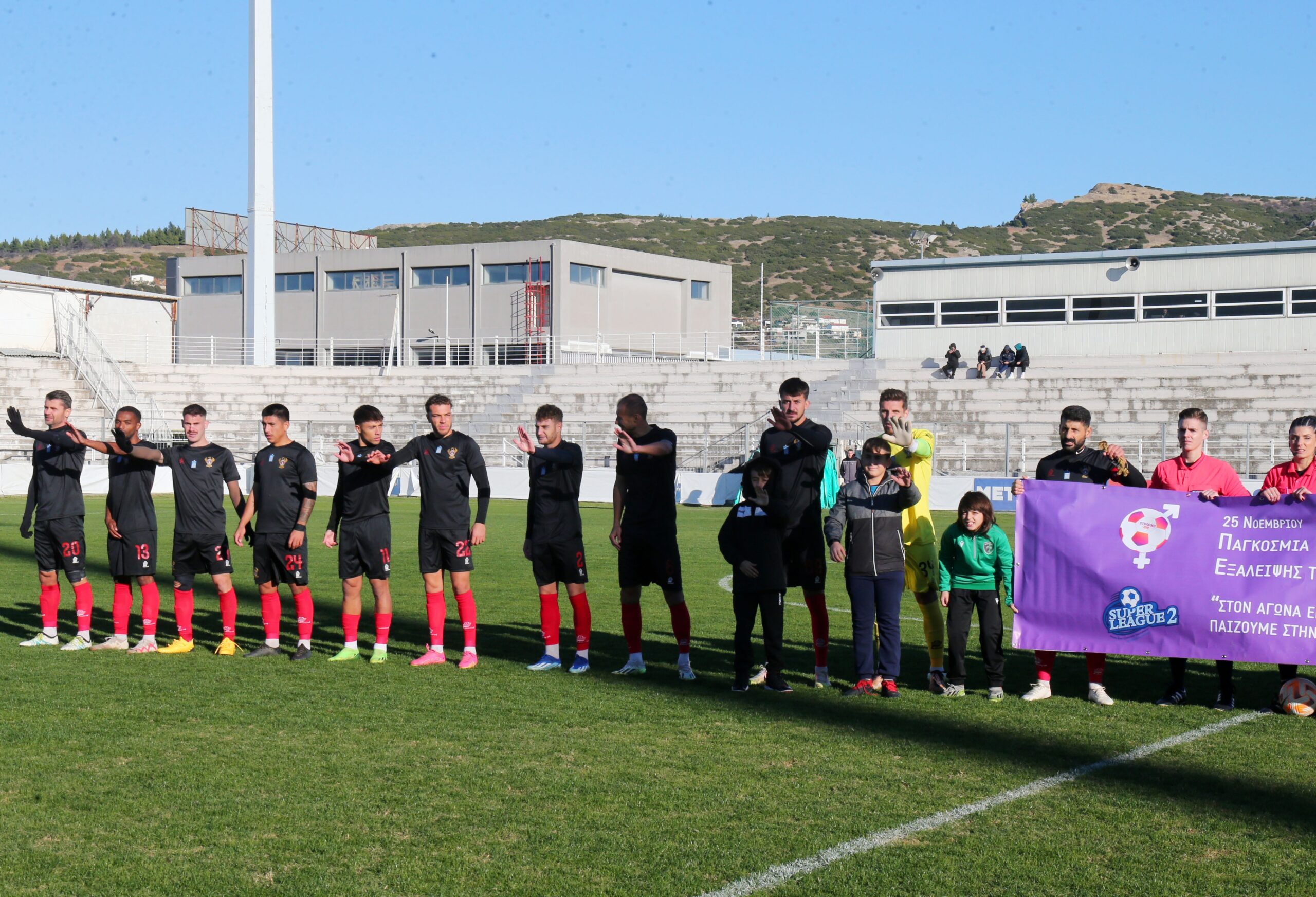Πριν από την έναρξη των παιχνιδιών της Κυριακής (26/11) στη Super League 2, οι παίκτες των ομάδων και οι διαιτητές του αγώνα έβγαλαν… κόκκινη κάρτα στη βία κατά των γυναικών.