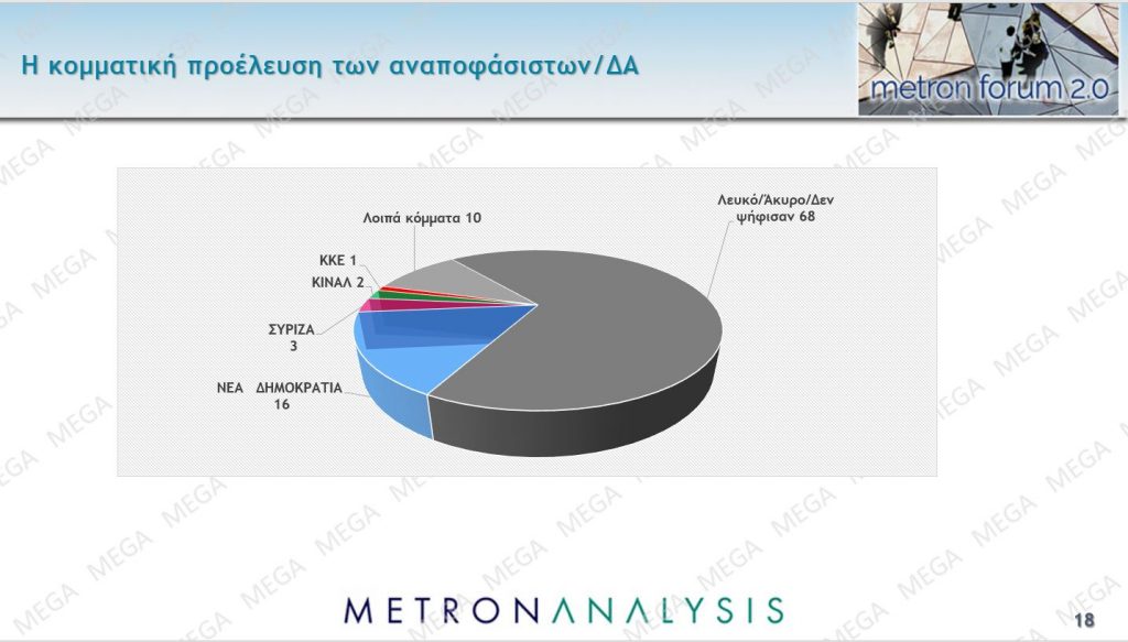 Αναφορικά με την κομματική προέλευση των αναποφάσιστων το 68% προέρχεται από εκείνους που είτε δεν ψήφισαν είτε έριξαν άκυρο/λευκό. Το 16%, ένα αρκετά μεγάλο ποσοστό δηλαδή, προέρχεται από τη Νέα Δημοκρατία, 3% από τον ΣΥΡΙΖΑ και 2% από το ΠΑΣΟΚ. Βλέπουμε, λοιπόν ότι πολλοί ψηφοφόροι της ΝΔ είναι απογοητευμένοι από την κυβέρνηση και ακόμη δεν έχουν αποφασίσει τι θα κάνουν. Αν δηλαδή θα επιστρέψουν στο γαλάζιο… μαντρί ή αν θα μετακινηθούν σε άλλα κόμματα.