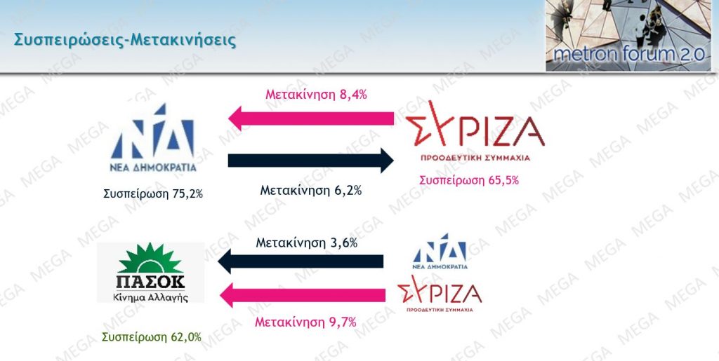 Βλέποντας τις συσπειρώσεις η ΝΔ έχει φτάσει στο 75,2% ενώ πριν μερικές ημέρες ήταν περίπου 4 μονάδες κάτω. Προς τη ΝΔ μετακινούνται 8,4% των ψηφοφόρων που προέρχονται από τον ΣΥΡΙΑ ενώ φεύγουν αντίθετα 6,2%.