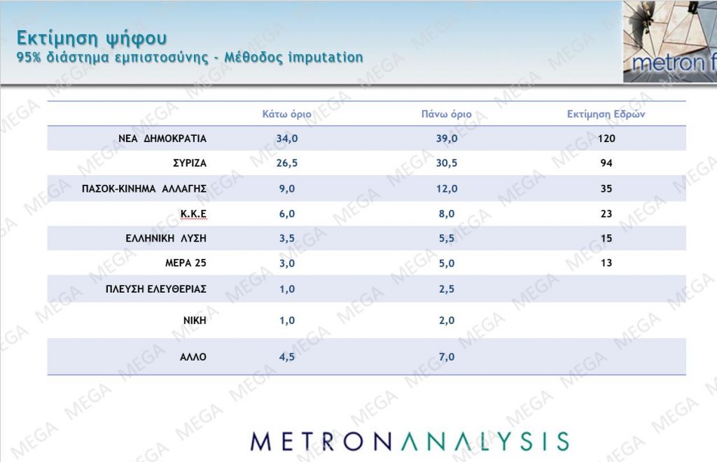 Η Metron Analysis δίνει και μια εκτίμηση ψήφου βάζοντας το χαμηλότερο και το υψηλότερο ποσοστό που μπορούν να λάβουν τα κόμματα.