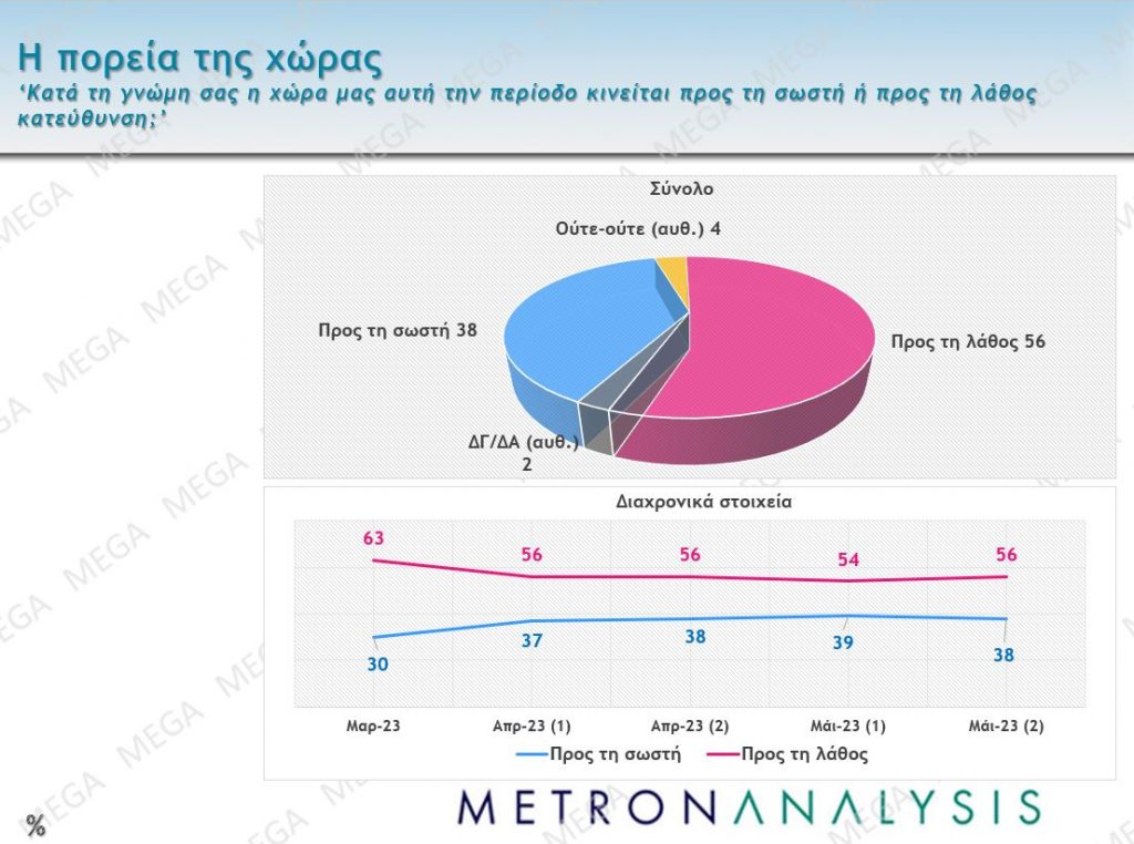 Προς τη λάθος κατεύθυνση κινείται η χώρα, λέει το 56% (άνοδος 2 μονάδες) και προς τη σωστή το 38%.