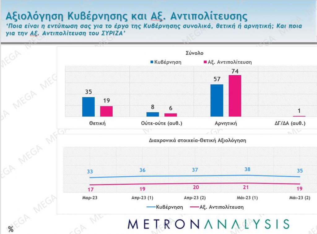 Στο 57% είναι η αρνητική αξιολόγηση για τη Νέα Δημοκρατία ενώ η θετική υποχώρησε κατά 3 μονάδες φτάνοντας το 35%.