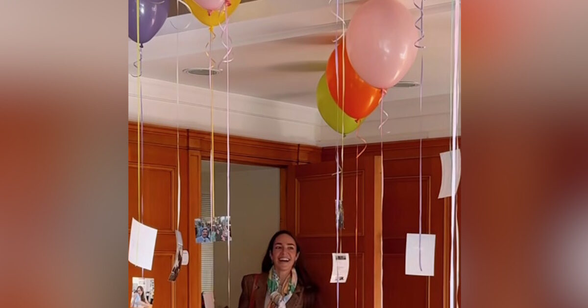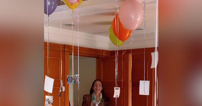 Ανοίγοντας την πόρτα, ανυποψίαστη, η Δόμνα Μιχαηλίδου βρέθηκε μπροστά σε πολύχρωμα μπαλόνια, που είχαν δεμένα πάνω τους φωτογραφίες της, από διάφορες στιγμές της ζωής της.