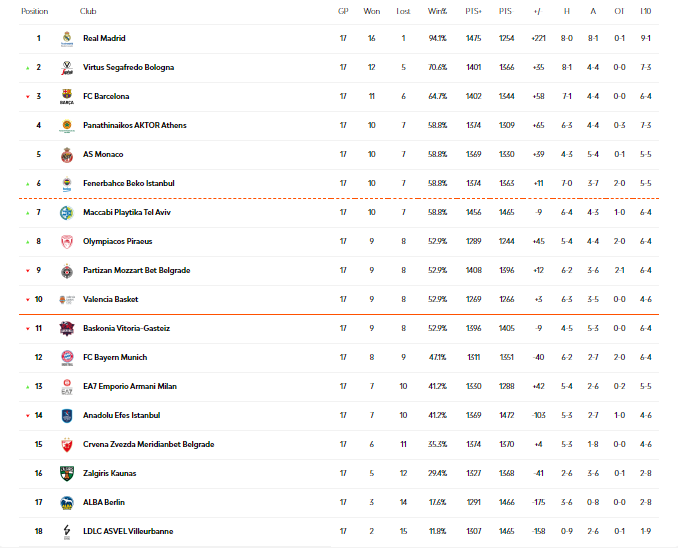 Από την άλλη, η ομάδα του Γιώργου Μπαρτζώκα είναι 8η με 9-8. Μαζί της, στο ίδιο ρεκόρ, έχει τρεις ομάδες, οι οποίες υστερούν στην ισοβαθμία. Ο λόγος για τις Παρτίζαν, Βαλένθια και Μπασκόνια.