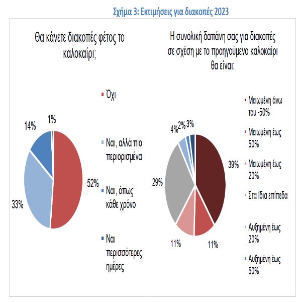 Ένας στους δύο πολίτες δεν θα κάνει φέτος διακοπές, όπως αυτό προκύπτει από σχετική έρευνα που διενήργησε από τις 6 έως τις 10 Μαΐου 2023 το Ινστιτούτο Έρευνας Λιανεμπορίου Καταναλωτικών Αγαθών (ΙΕΛΚΑ) με δείγμα 1.000 καταναλωτές.