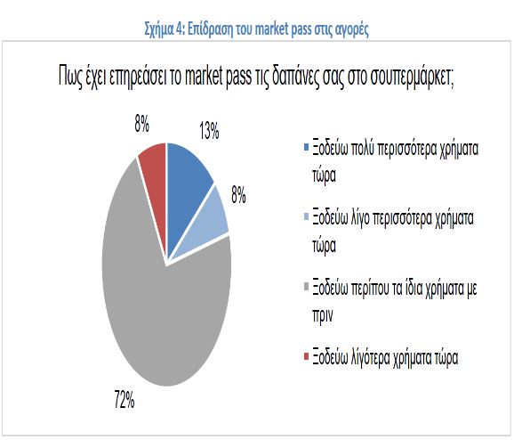 Όσον αφορά στο market pass, το οποίο είναι ακόμα εν ισχύ, από την έρευνα προκύπτει ότι το 72% του κοινού δεν έχει επηρεαστεί από αυτό. Το 8% δηλώνει ότι ξοδεύει λιγότερα χρήματα, προφανώς αντικαθιστώντας μέρος της δαπάνης ιδίων χρημάτων με χρήματα από το market pass, ενώ το 21% δηλώνει ότι ξοδεύει περισσότερα χρήματα σήμερα, προσθέτοντας χρηματική δαπάνη μέσω του market pass στην ιδιωτική δαπάνη χρημάτων. Συνολικά φαίνεται μία θετική επίδραση στην αγορά από το market pass, αλλά σε μικρό βαθμό, σύμφωνα με την έρευνα του ΙΕΛΚΑ.