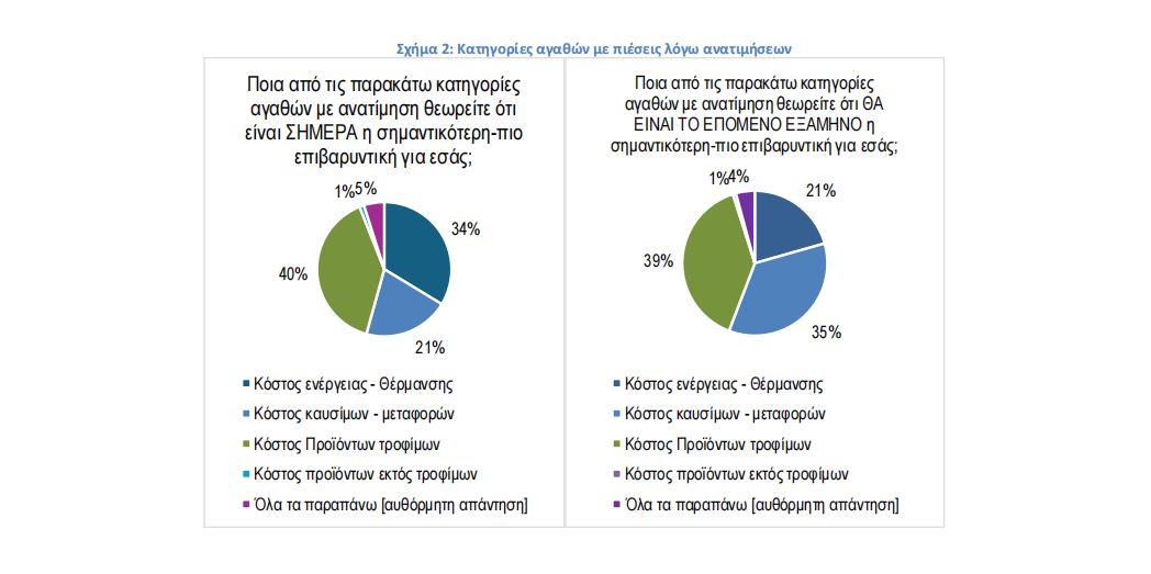 Όπως φαίνεται στο σχήμα 2, ως προς τις κατηγορίες προϊόντων με τη μεγαλύτερη επιβάρυνση, οι καταναλωτές εκτιμούν ότι η μεγαλύτερη επιβάρυνση σήμερα είναι από τις τιμές καυσίμων-ενέργειας (αθροιστικά) και τις τιμές τροφίμων.