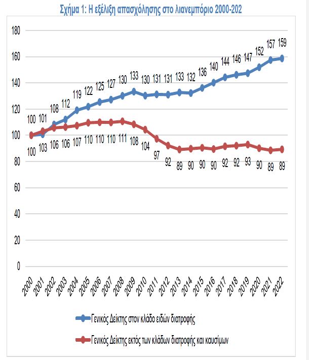 Συγκεκριμένα από την επεξεργασία των στοιχείων απασχόλησης που παρέχει σε τριμηνιαία βάση η ΕΛ.ΣΤΑΤ. προκύπτει ότι την περίοδο 2000-2022 το λιανεμπόριο τροφίμων παρουσιάζει αύξηση της απασχόλησης κατά 60%, σε αντίθεση με το υπόλοιπο λιανικό εμπόριο το οποίο παρουσιάζει μείωση κατά 11%. Πρακτικά το λιανεμπόριο τροφίμων το 2022 απασχολεί σχεδόν 75 χιλ. περισσότερους εργαζόμενους σε σχέση με το 2000 ξεπερνώντας τις 217 χιλ. άμεσα απασχολούμενους.