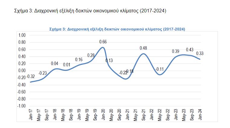 Το οικονομικό κλίμα παρουσιάζει πιο βελτιωμένη εικόνα, η οποία οφείλεται στο συνδυασμό των εκτιμήσεων των στελεχών (πωλήσεις, τιμές, οικονομικές συνθήκες). Ο δείκτης καταγράφεται στο 0,33, με ελάχιστη πτώση σε σχέση με την προηγούμενη μέτρηση και στα σχετικά υψηλότερα επίπεδα που έχουν καταγραφεί γι’ αυτή τη μελέτη. Η αποκλιμάκωση οφείλετε στη εκτίμηση μικρότερης αύξησης των πωλήσεων και στην εκτίμηση για περιορισμό των ανατιμήσεων.