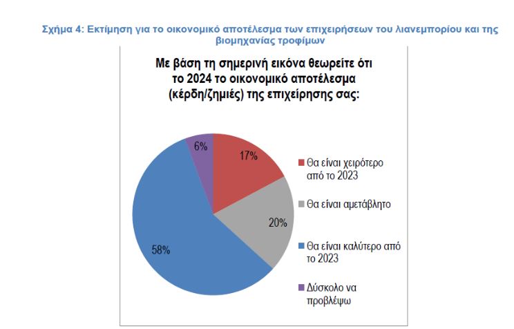 Μεταξύ των θεμάτων που εξετάστηκαν, είναι η εκτίμηση της παρούσας οικονομικής κατάστασης των επιχειρήσεων, αλλά και η επίδραση των ανατιμήσεων. Η πλειοψηφία των επιχειρήσεων σε ποσοστό 58% αναμένει καλύτερο οικονομικό αποτέλεσμα ως προς την κερδοφορία της το 2024, ενώ 17% αναμένει χειρότερο οικονομικό αποτέλεσμα. Οι υπόλοιπες επιχειρήσεις του δείγματος, είτε δεν έχουν ακόμα σαφή εικόνα, είτε δεν αναμένουν μεταβολή. Πρακτικά οι περισσότερες επιχειρήσεις του κλάδου του λιανεμπορίου και της βιομηχανίας τροφίμων (7 στις 10 επιχειρήσεις) αναμένουν κάποια μικρή κερδοφορία το 2024, ενώ λιγότερες από 1 στις 10 αναμένουν ζημιές.