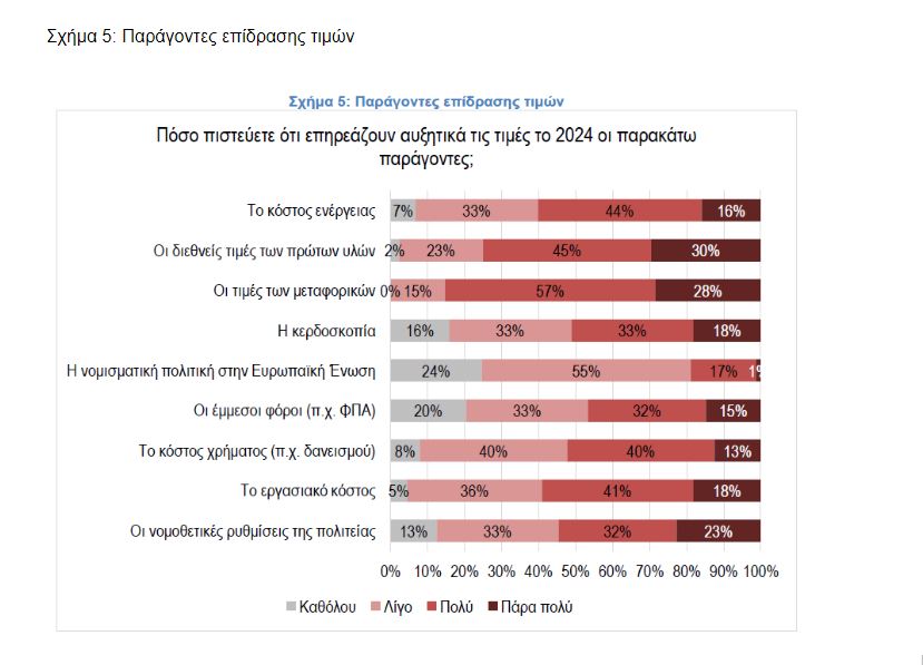 Στην έρευνα του ΙΕΛΚΑ καταγράφονται οι παράγοντες που επηρεάζουν αυξητικά τις τιμές το 2024. Όπως προκύπτει, το φαινόμενο είναι πολυπαραγοντικό. Οι παράγοντες που επηρεάζουν σημαντικά τις αυξήσεις τιμών σύμφωνα με τα στελέχη του κλάδου είναι: το κόστος μεταφορικών (85%), οι διεθνείς τιμές πρώτων υλών (75%), το κόστος ενέργειας (60%), το εργασιακό κόστος (59%), οι νομοθετικές ρυθμίσεις της πολιτείας (55%) και το κόστος χρήματος (53%). Όπως σημειώνεται «τα στοιχεία αυτά δείχνουν την μεγάλη ένταση των πληθωριστικών πιέσεων και την πολυπλοκότητα αντιμετώπισης του φαινομένου, λόγω των πολλαπλών παραγόντων που επιδρούν στις τιμές».