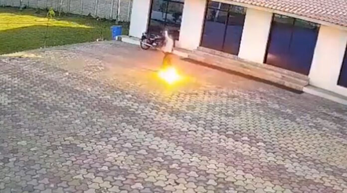 Το ζώο τρομάζει και απομακρύνεται, αλλά ο Ινδός δεν ησυχάζει. Κρατάει το κοντάρι ψηλά και κάνει μερικά βήματα πίσω. Το μέταλλο χτυπάει σε καλώδια υψηλής τάσης και το ρεύμα τον σκοτώνει ακαριαία.