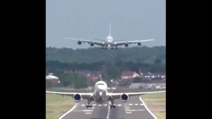 Το περιστατικό συνέβη το περασμένο Σάββατο, όταν κάμερες κατέγραψαν την στιγμή που αεροπλάνο προσγειωνόταν λίγα μέτρα πίσω από αεροσκάφος που απογειωνόταν.