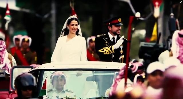 Οι διάδοχοι του θρόνου της Ιορδανίας, χαμογελώντας, χαιρετούν το πλήθος που έχει μαζευτεί για να θαυμάσει το νεαρό ζευγάρι.