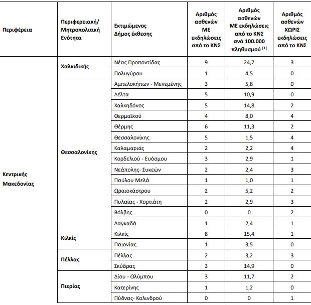 Έχουν καταγραφεί κρούσματα λοίμωξης από τον ιό του Δυτικού Νείλου στη Μητροπολιτική Ενότητα Θεσσαλονίκης και στις Περιφερειακές Ενότητες Ημαθίας, Κιλκίς, Πέλλας, Πιερίας, Χαλκιδικής, Σερρών, Τρικάλων και Λάρισας.