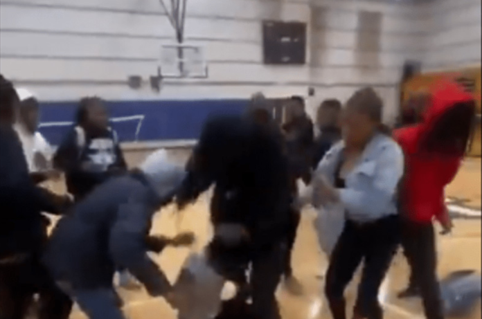 Στο βίντεο φαίνεται ο καβγάς να ξεκινά όταν ένας νεαρός με μαύρη μπλούζα ρίχνει γροθιά σε έναν άλλο μαθητή με κόκκινη μπλούζα.