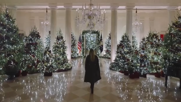 Η Μελάνια Τραμπ ανοίγει τις πόρτες του Λευκού Οίκου και αποκαλύπτει τις στολισμένες αίθουσες, που πλημμυρίζουν φως.