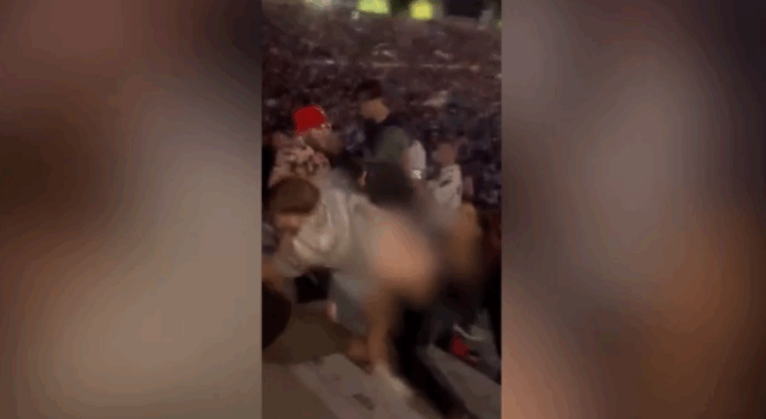 Εκείνη μπήκε στη μέση να τους χωρίσει και τότε ο εξοργισμένος άντρας ξέσπασε, ρίχνοντάς την στις κερκίδες και χτυπώντας την ξανά και ξανά, ακόμα και αφού είχε χάσει τις αισθήσεις της.