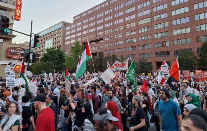 Ο νεαρός δημοσιογράφος είναι ένας από τους χιλιάδες που πλημμύρισαν τους δρόμους της Ουάσιγκτον για να διαδηλώσουν για τον έναν χρόνο από την αρχή του πολέμου στη Μέση Ανατολή.