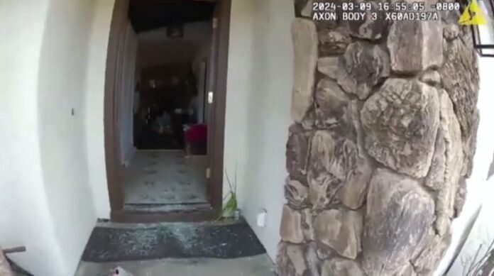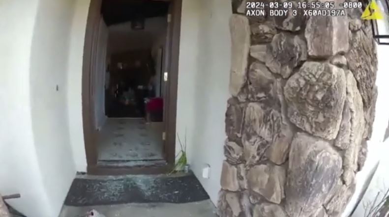Στο βίντεο φαίνεται ο νεαρός να βγαίνει από το σπίτι κρατώντας στα χέρια του το εργαλείο και να κινείται προς τον αστυνομικό, ο οποίος ακούγεται να του φωνάζει «κάνε πίσω, κάνε πίσω αλλιώς θα σε πυροβολήσω».