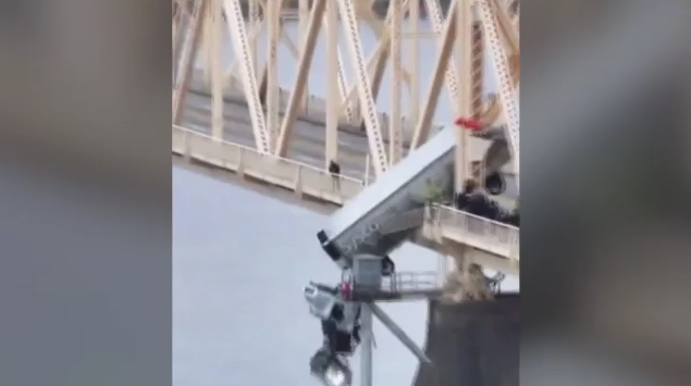 Στα πλάνα φαίνεται το φορτηγό να βγαίνει από τη λωρίδα κυκλοφορίας του για να αποφύγει να χτυπήσει ένα αυτοκίνητο που είχε ακινητοποιηθεί, προτού καταλήξει να πέφτει πάνω στην 26χρονη. Εκείνη με τη σειρά της αρχίζει τους ελιγμούς για να αποφύγει τη σύγκρουση και καταλήγει να σπάει το κιγκλίδωμα της γέφυρας και να κρέμεται.