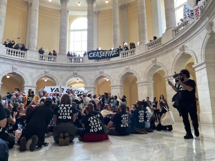 Μέσα στο αμερικανικό Κογκρέσο εκατοντάδες Αμερικανοεβραίοι ζητούν κατάπαυση του πυρός στη Γάζα. Κρατούν πανό με συνθήματα όπως «Οι Εβραίοι ζητούν άμεσα εκεχειρία», «Όχι ξανά» και «Αφήστε τη Γάζα να ζήσει».