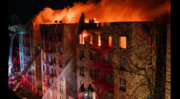 Πύρινες γλώσσες τυλίγουν την κορυφή του 17ωροφου κτιρίου στο Μπρόνξ της Νέας Υόρκη.
