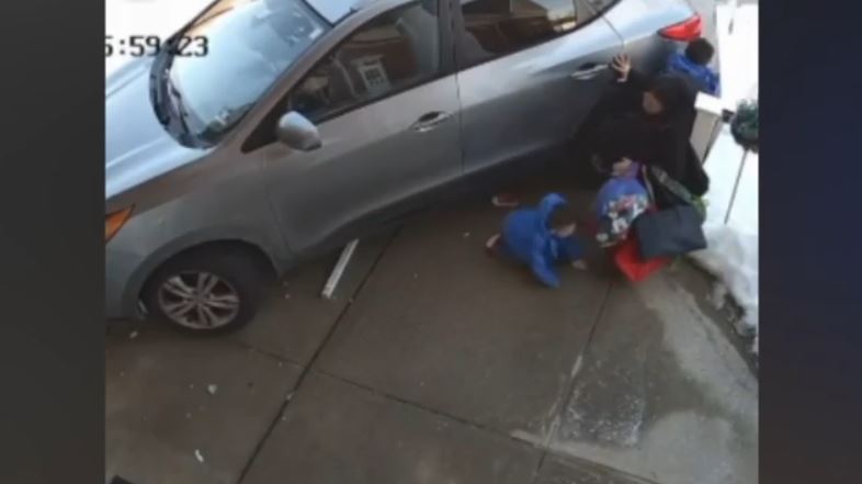 Η μητέρα, κρατώντας τους δύο γιους της, κατάφερε να τραβήξει ένα από τα αγόρια δευτερόλεπτα πριν το αυτοκίνητο συγκρουστεί με μία κολόνα και χτυπήσει τον γιο της στο πόδι.