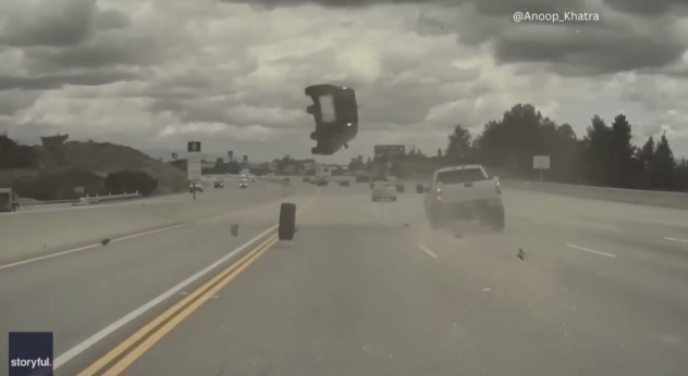 Το αυτοκίνητο χτύπησε το ελαστικό και εκτοξεύτηκε αρκετά μέτρα μακριά από το οδόστρωμα. Το όχημα αναποδογύρισε στον αέρα πριν προσγειωθεί με στην άσφαλτο.