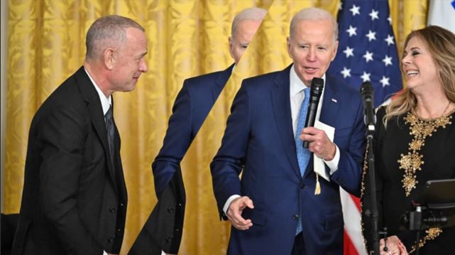 Ο Μπάιντεν κάλεσε και τον Τομ Χανκς να μιλήσει, με τον ηθοποιό να μη χάνει την ευκαιρία να ξεδιπλώσει το χιούμορ του.