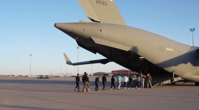 Φορώντας χειροπέδες, με αλυσίδες στη μέση και στα πόδια μετανάστες οδηγούνται σε αεροσκάφος του αμερικανικού στρατού που θα τους μεταφέρει σε κάποια από τις χώρες της Λατινικής Αμερικής από την οποία κατάγονται.