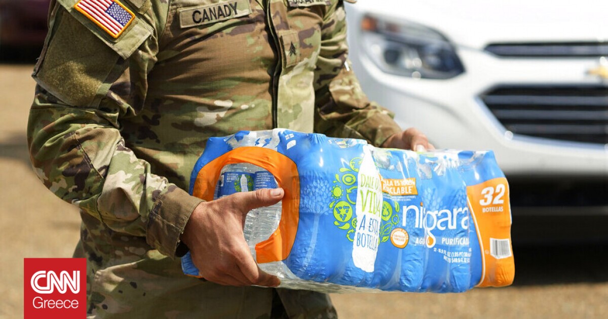 Μεγάλα φορτηγά γεμάτα με εκατοντάδες χιλιάδες μπουκάλια νερό έχουν σταθμεύσει έξω από ένα τεράστιο εκθεσιακό κέντρο στο Τζάκσον του Μισισιπή, με Αμερικανούς στρατιώτες να τα ξεφορτώνουν με τη βοήθεια γερανών και εκσκαφέων.