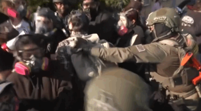 Διαδηλωτές που έχουν βγει έξω για να διαμαρτυρηθούν για τις επιχειρήσεις της Ομοσπονδιακής Υπηρεσίας Μετανάστευσης συγκρούονται με τους αστυνομικούς που προσπαθούν να απωθήσουν το πλήθος.